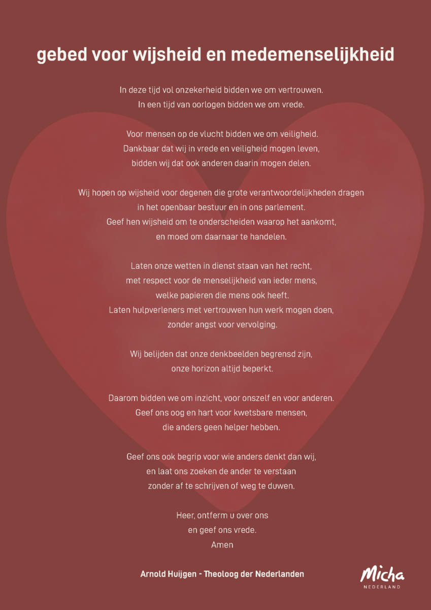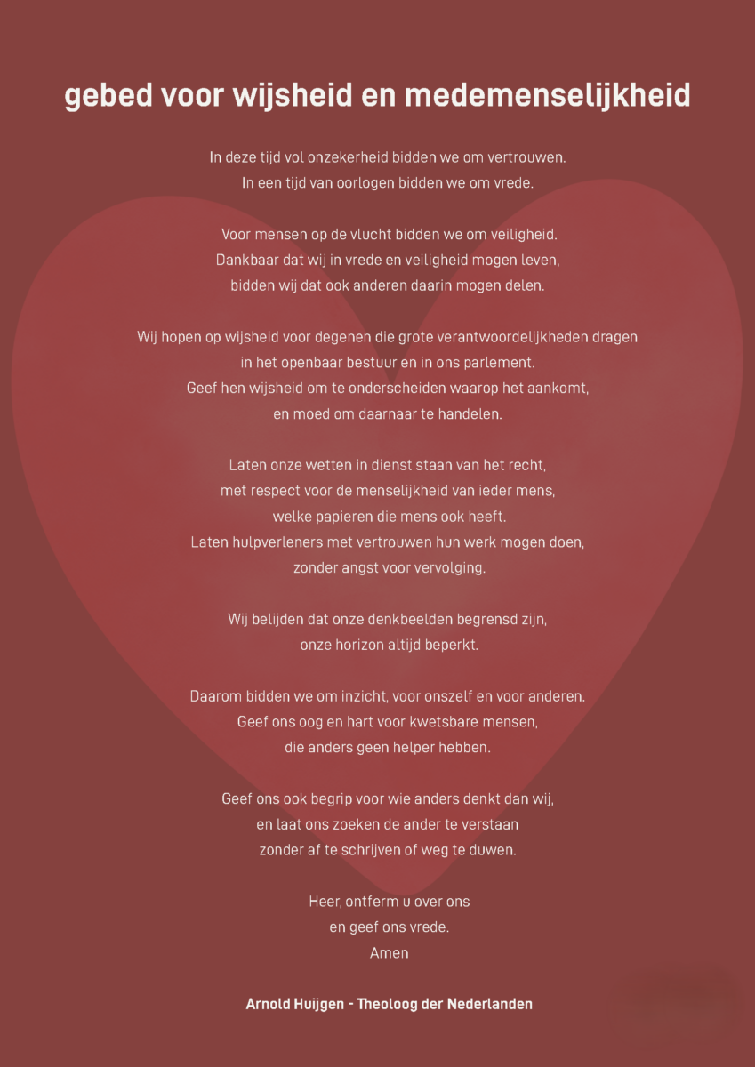 Theoloog der Nederlanden Arnold Huijgen schreef een gebed ‘voor wijsheid en medemenselijkheid’ voor het gebedsweekeinde van 10 tot en met 12 april. In dat weekend wordt in kerken, moskeeën, synagogen en andere gebedshuizen dit gebed (pdf) gebeden, en ook door gelovigen van verschillende religies thuis.